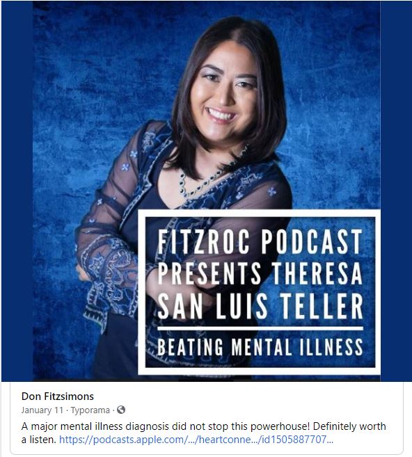 Theresa San Luis Teller has advocated for people with mental illness in the St. Louis area. She has been interviewed on TV four times including PBS and NBC affiliate and has been interviewed on podcast and radio.